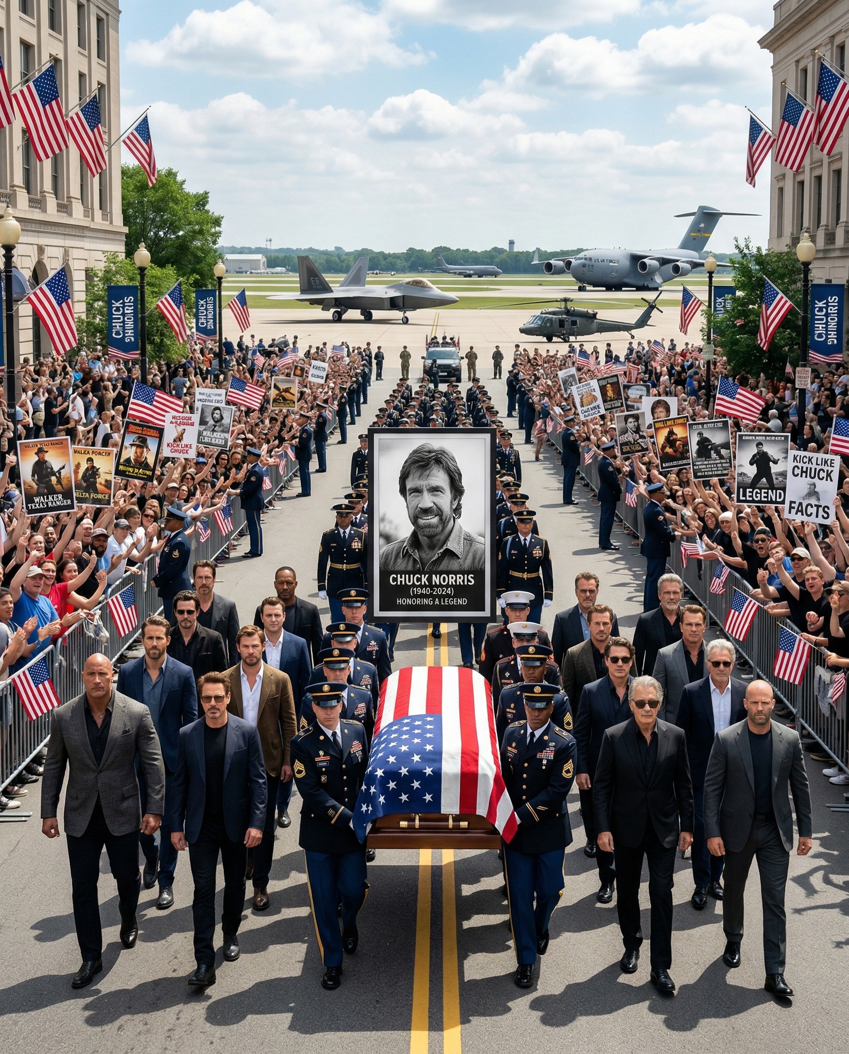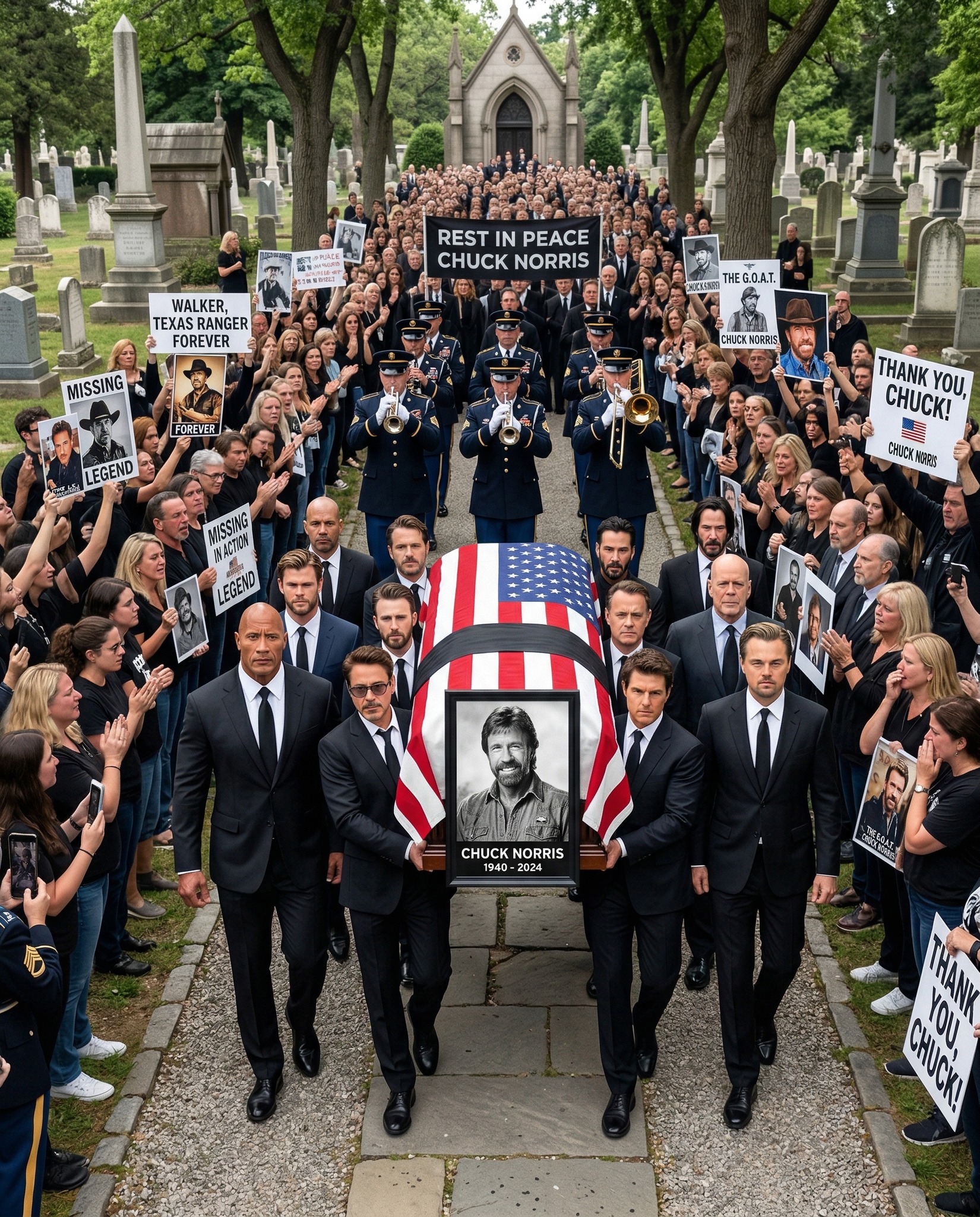 A profound silence settles over a solemn cemetery as the world gathers to honor Chuck Norris, a name forever linked to strength, honor, and resilience. Beneath towering trees and gray skies, a slow-moving funeral procession carries not only a flag-draped coffin, but the memory of a man whose legacy shaped generations. This is more than a farewell—it is a historic tribute to a timeless warrior whose impact reached far beyond cinema.