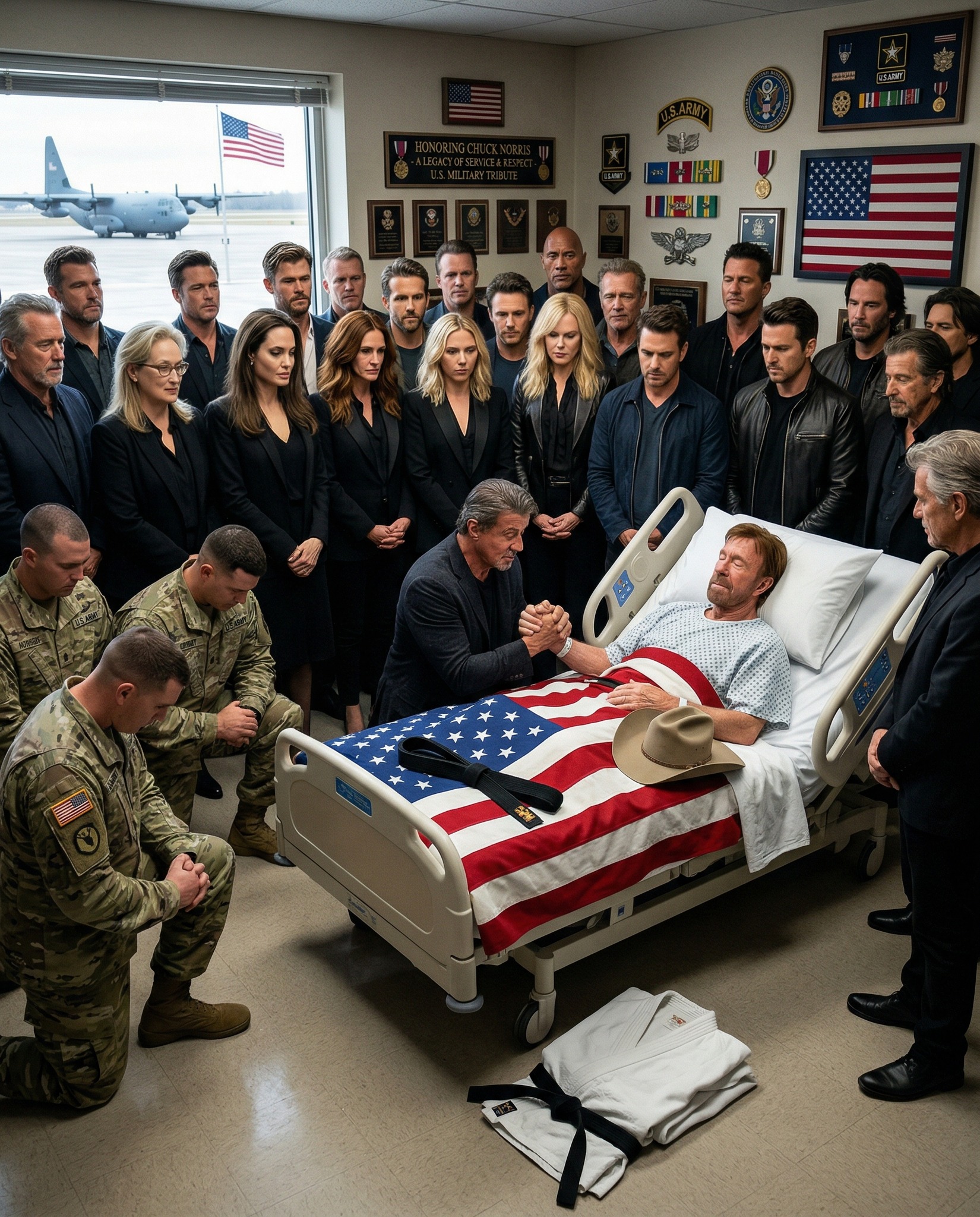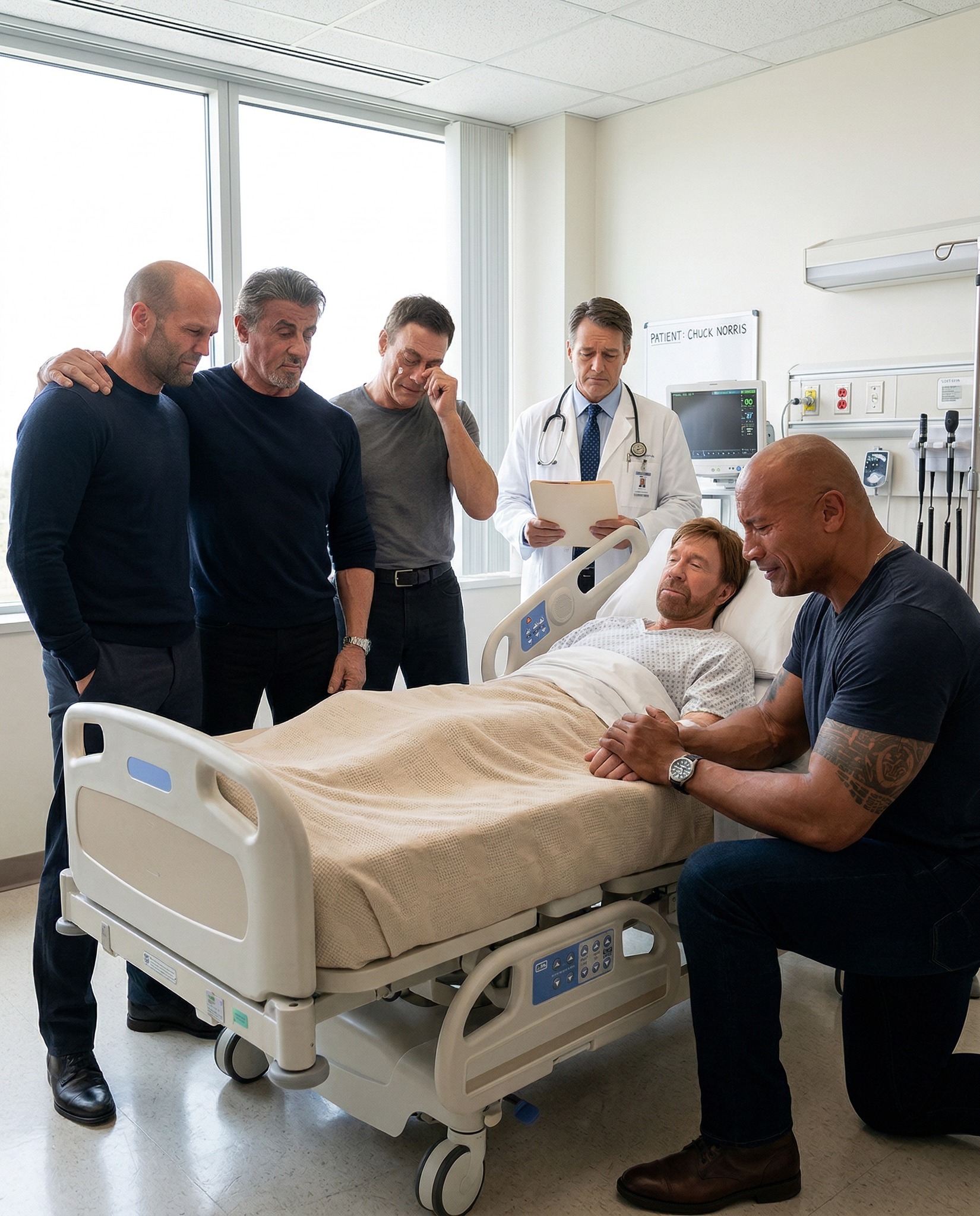 In a quiet hospital room filled with solemn reflection, four fellow action icons stood beside the man they had long admired—Dwayne Johnson, Sylvester Stallone, Jason Statham, and Jean-Claude Van Damme. No cameras. No spotlight. Only silence, memory, and brotherhood.