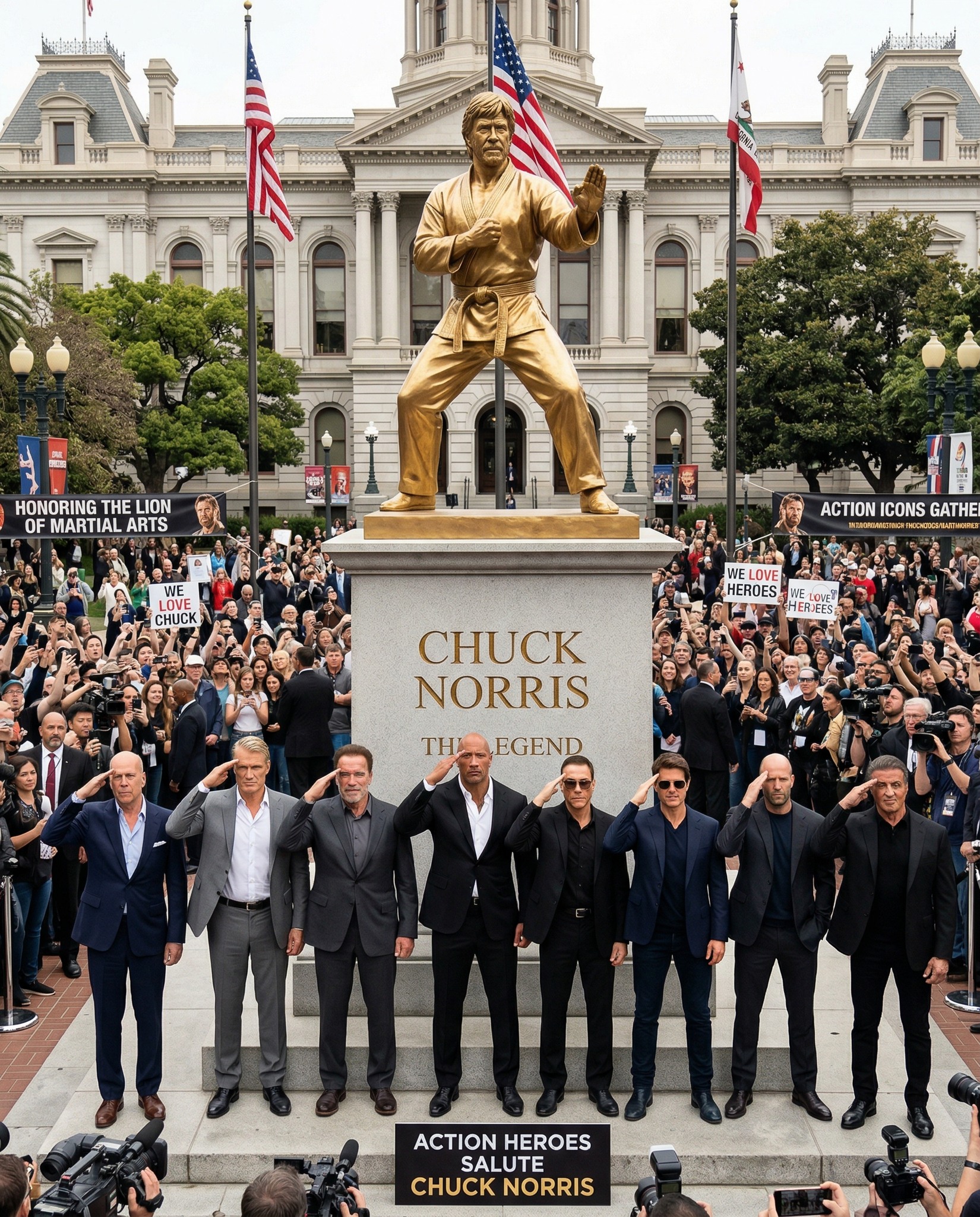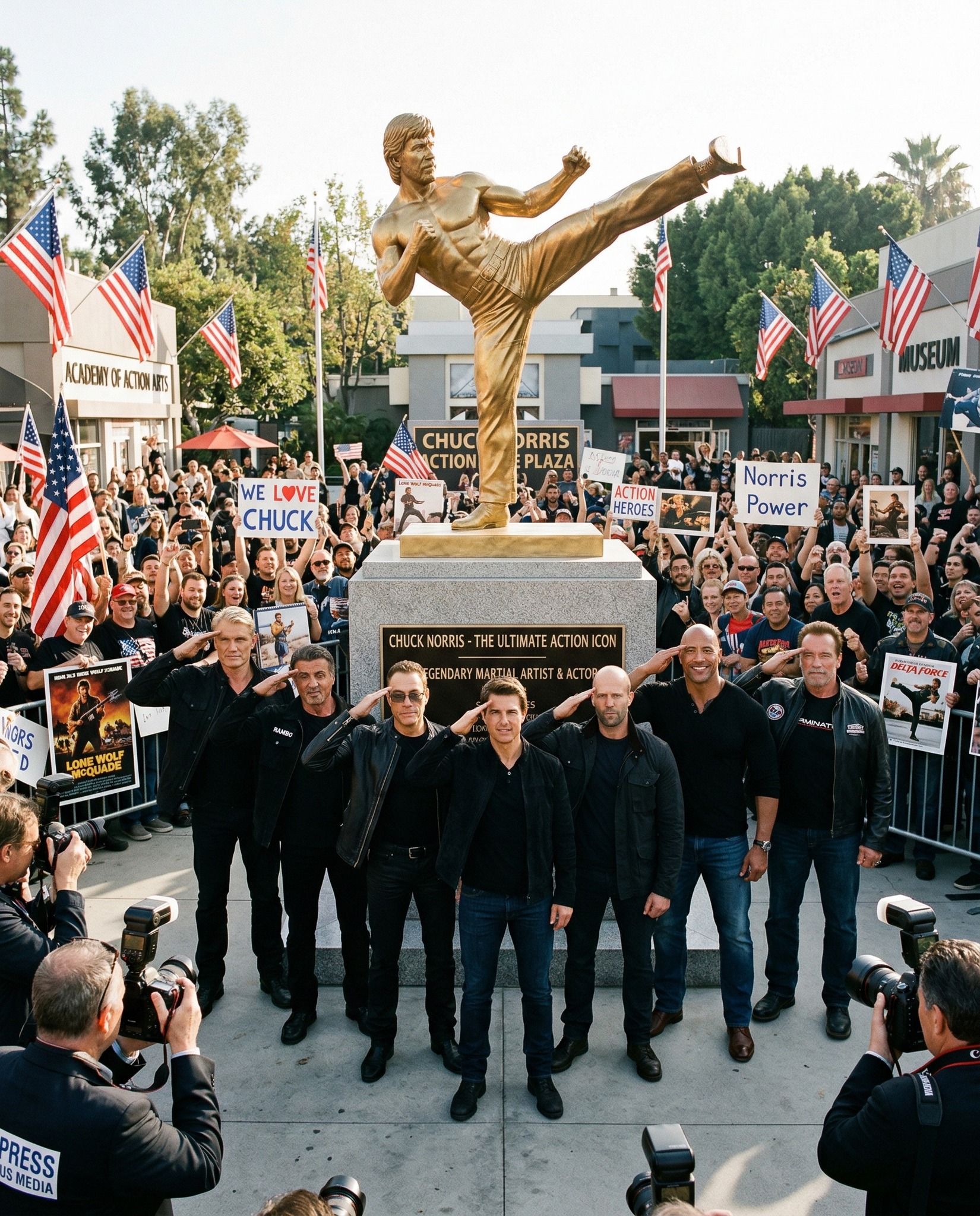 Beneath a sky filled with reverence, Hollywood’s most iconic action stars gather in a powerful public tribute to a man whose name became synonymous with courage, discipline, and cinematic heroism. In a grand civic square, before a towering golden monument of Chuck Norris, eight legendary figures stand shoulder to shoulder in solemn unity, honoring a pioneer who helped shape the action genre itself.