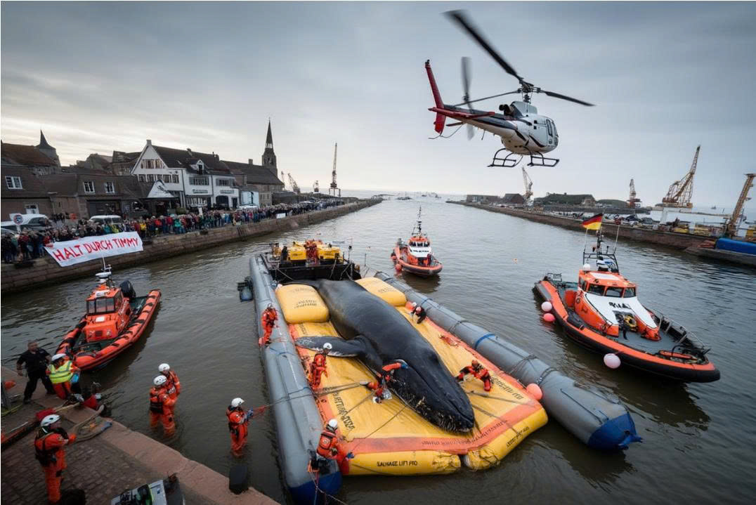 Once Timmy is safely lifted onto the tarp, the plan is to secure it between two pontoons. These pontoons will be towed by a powerful tugboat, slowly guiding Timmy toward deeper waters — away from the shallow bay where he’s been trapped for weeks. The final goal is to reach the North Sea, and from there, ultimately guide the whale back to the open Atlantic Ocean.