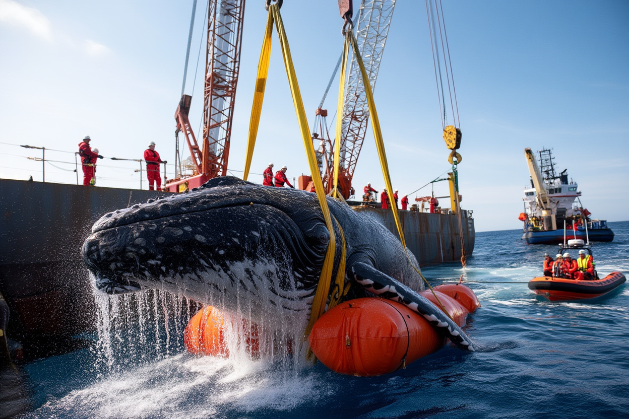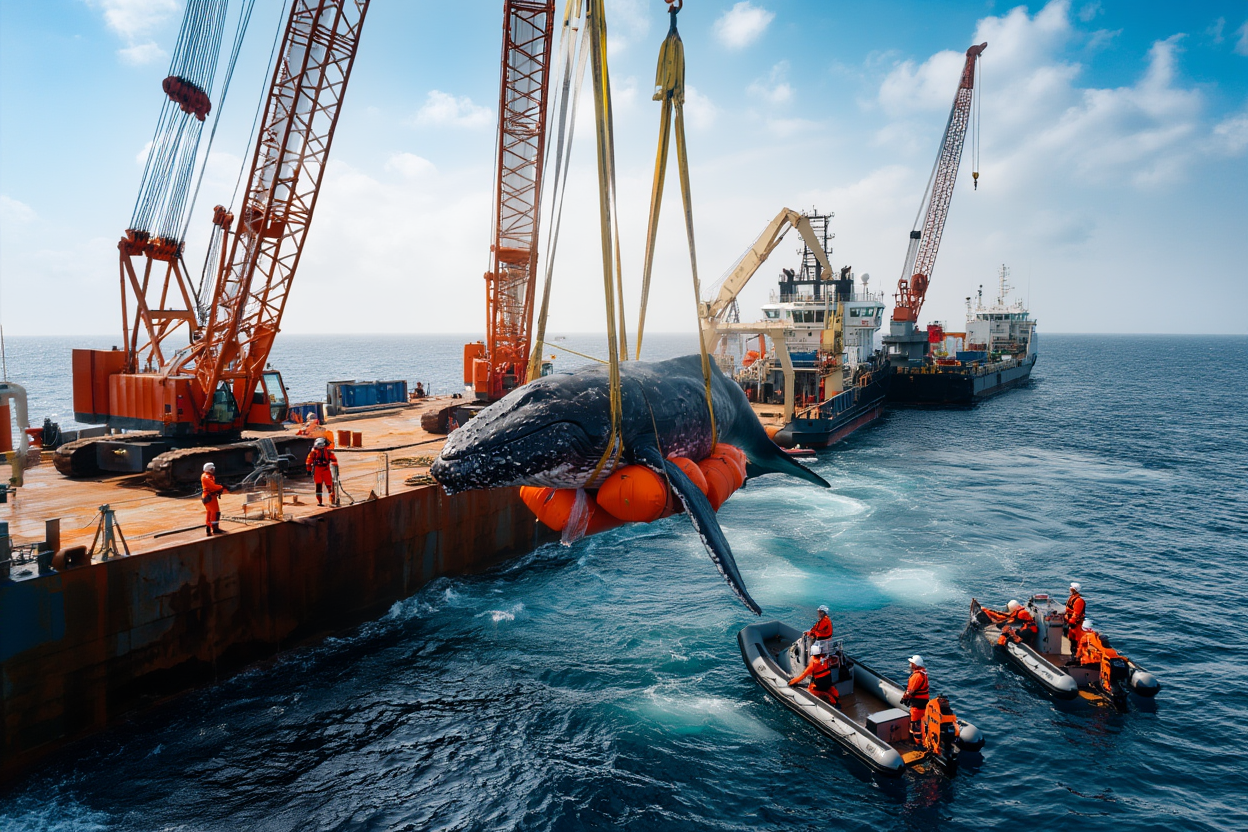 The scene is overwhelming — steel and waves clash with the soft, vulnerable form of a living giant suspended between the sea and sky. As the rescue operation progresses, each lift and adjustment brings the whale closer to buoyancy and, most importantly, closer to freedom.