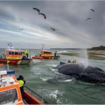 With a team of experts working tirelessly, water pours from the whale’s enormous body as heavy cranes and bright orange flotation devices coordinate to lift the whale from the shallow, perilous sands. The delicate task requires flawless teamwork — each movement a testament to the combined strength of nature’s power and human determination.