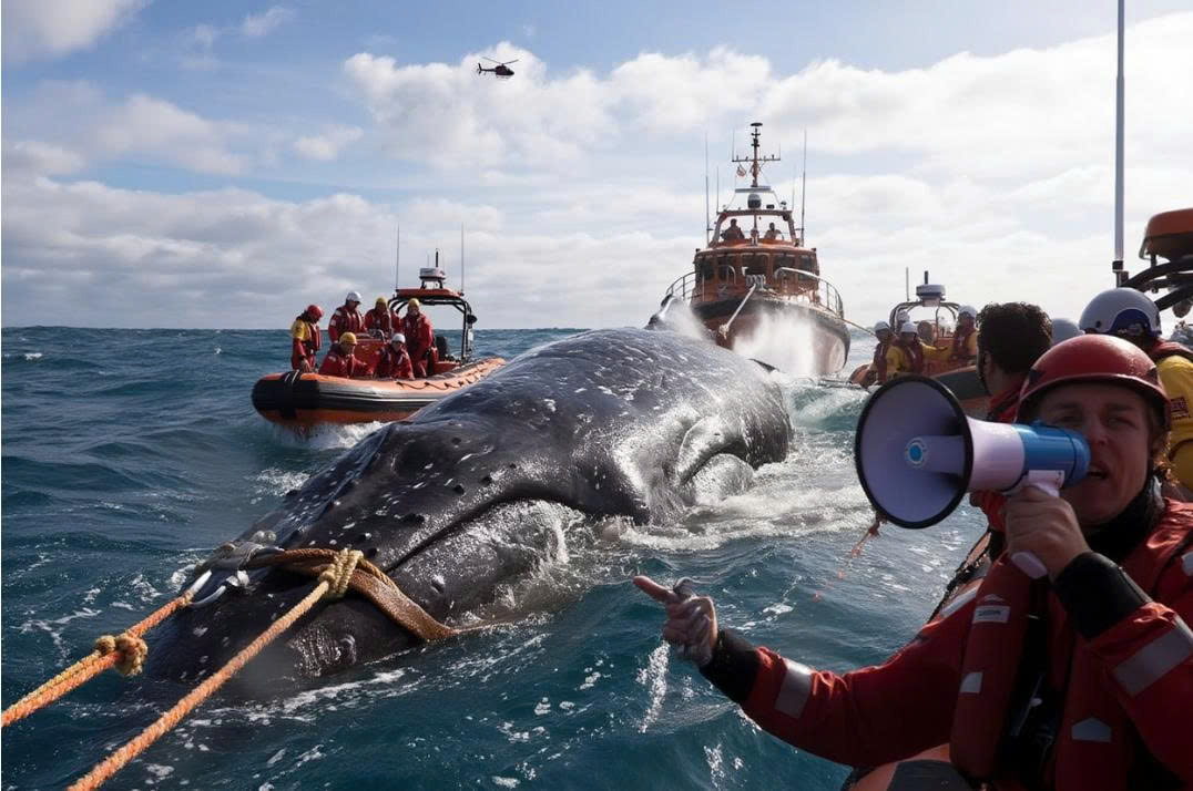 The rescue operation is nothing short of a marvel of teamwork and precision. Teams, dressed in vibrant red and yellow gear, are positioned on various vessels, using megaphones to communicate instructions. They maintain careful tension on the guide ropes, but never pull too hard — instead, they give Timmy the space he needs to move freely and naturally. The goal is clear: to guide Timmy towards the open sea without forcing him, allowing him to regain his strength and momentum at his own pace.