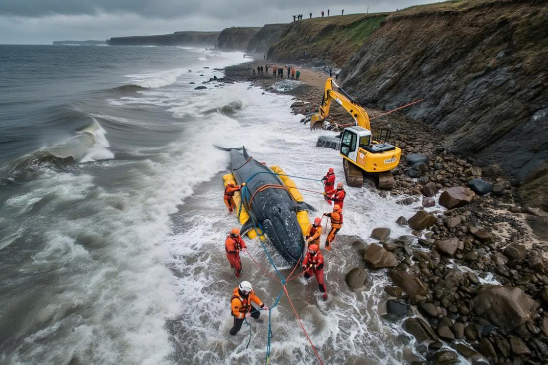 Timmy’s enormous body rocks with each surge of the sea, his movements erratic as the powerful waves threaten to push him back. The team braces, shouting encouragement to one another and maintaining steady pressure as they work tirelessly to keep him safe. Every inch of progress is hard-won, but the team’s resolve is unwavering. This is not just a rescue — it’s a fight for survival, a true test of endurance for both the whale and the humans.