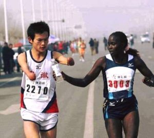 Kiplimo was at the peak of her career, leading the race and on track for a first-place finish. At the 6.2-mile (10km) mark, she encountered a fellow competitor—an elite runner from China who was a double amputee. He was struggling, dehydrated, and unable to grasp the water bottles at the hydration stations.