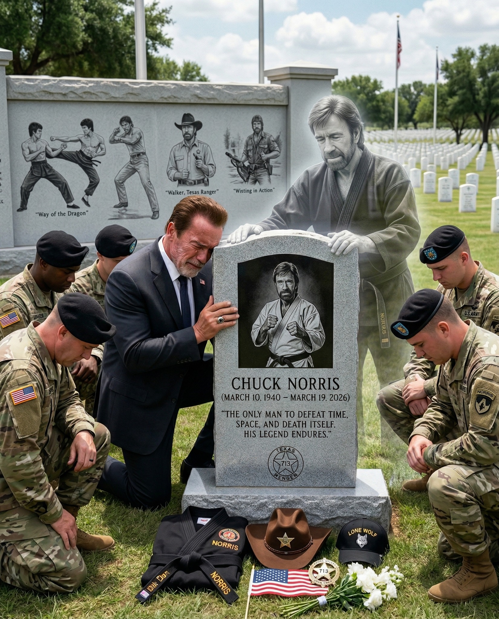 His hand reached out to touch the cool surface of the stone bearing the name Chuck Norris. It was a gesture that bridged decades of camaraderie and a shared cinematic history that defined the meaning of an “action hero” for the entire world. Arnold’s head bowed low, his eyes closed against the sting of grief, while surrounding him, American soldiers stood in a formation of absolute respect. This was the final salute to a man who, for many, was the ultimate personification of the American spirit.