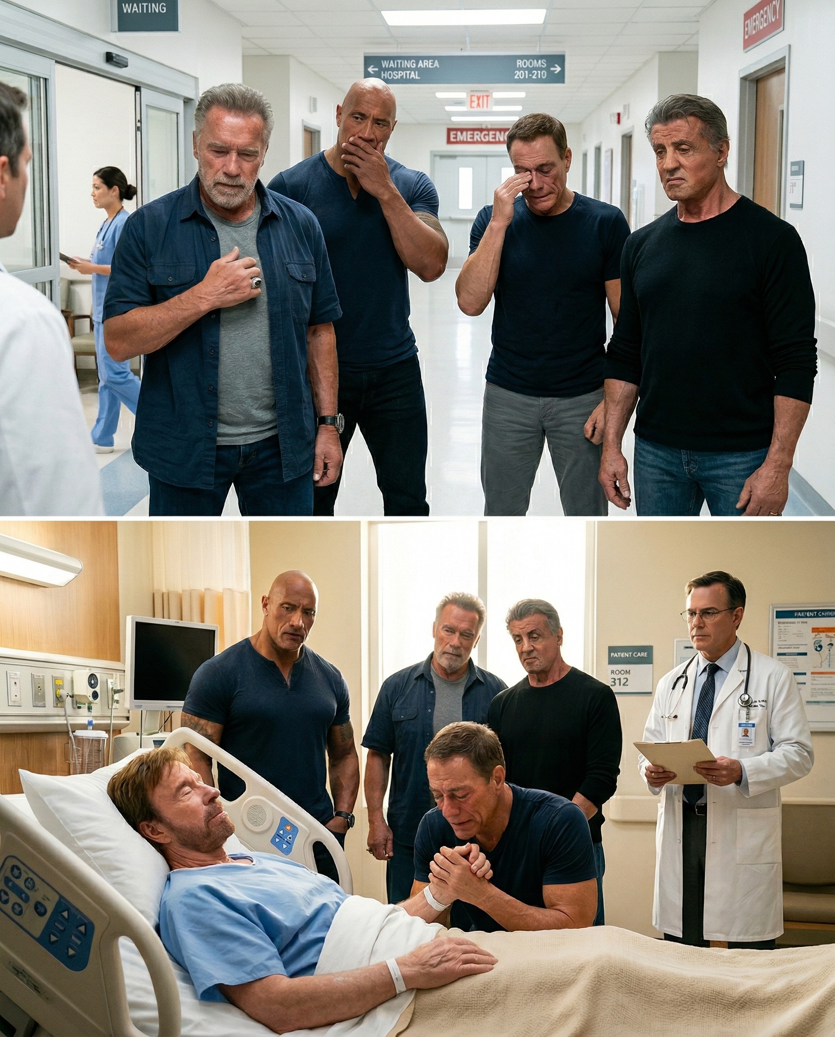 Sylvester Stallone stood closest, his hand resting gently on Bruce Willis’s shoulder. His face, so often associated with the grit of Rocky Balboa, now revealed a deeper vulnerability. Tom Cruise, standing beside him, appeared equally moved. Known for his boundless energy, he now stood still, his expression softened by grief. At the bedside, Bruce Willis knelt, holding Chuck Norris’s hand. Willis, whose career was defined by wit and toughness, now showed the courage to be present in a moment of profound loss.