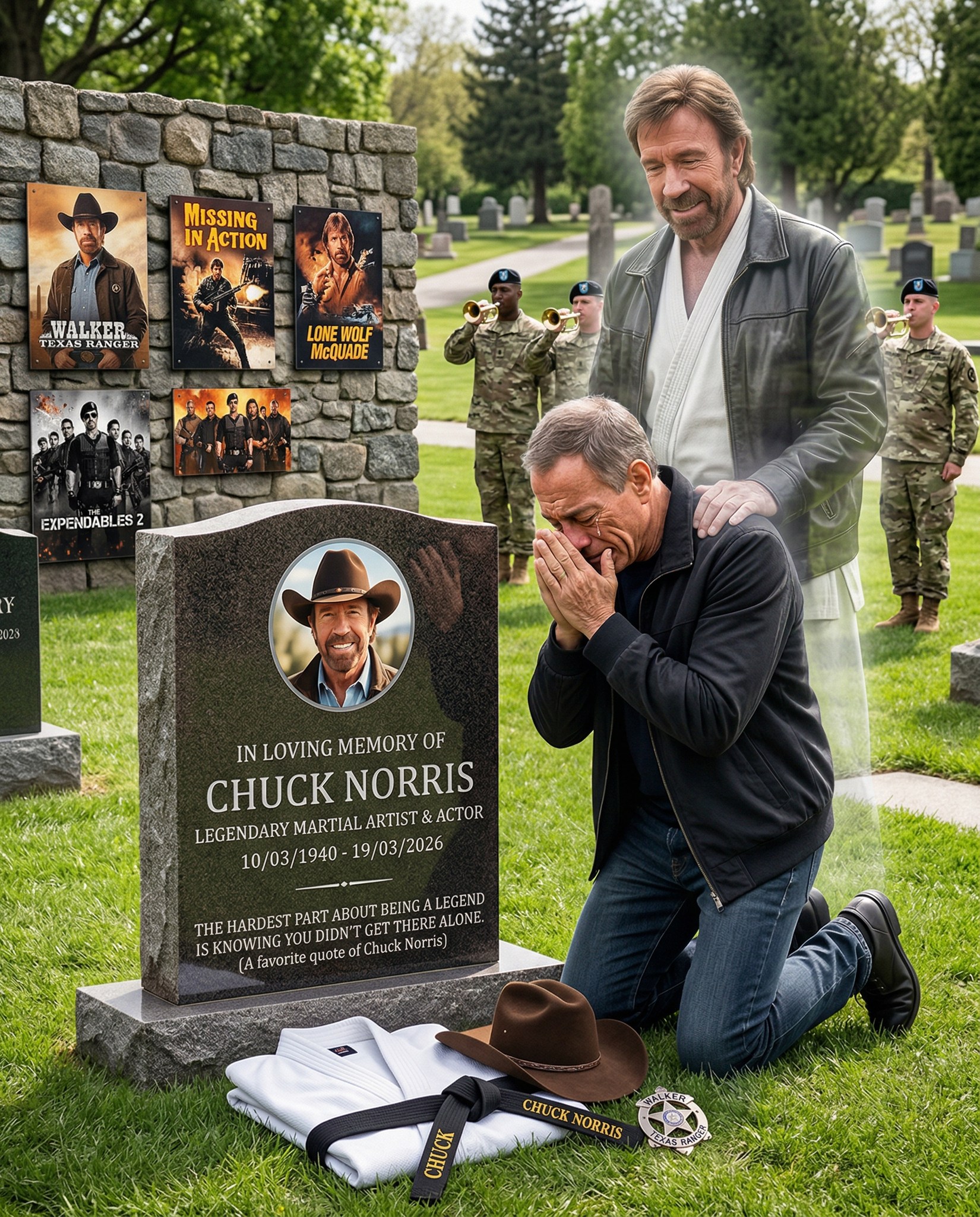 At the foot of the grave lies a pristine white martial arts uniform, folded with meticulous care. Beside it sits a solitary cowboy hat, its brim weathered by the sun of a thousand trails, looking as though it were simply waiting for a hand to reach out and reclaim it. A collection of medals glints in the soft light, each a silent witness to a life lived in service of discipline, honor, and a relentless pursuit of mastery.