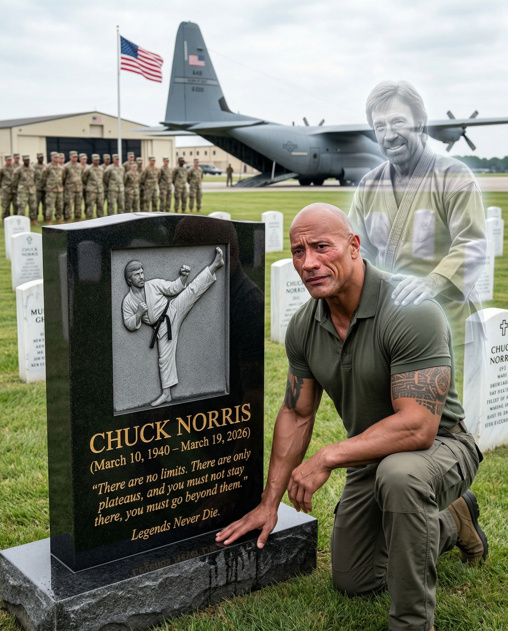 I will carry it on, he murmured. In that solitary promise, the essence of the warrior spirit was preserved. Legends never truly die; they transform into the inspiration that fuels those who follow. As Johnson walked away, the clouds parted slightly, letting a faint, golden light touch the earth. Chuck Norris’s name remained etched in stone, but his spirit was now moving with the man who vowed to never let that flame of honor go out. The silence of the morning was no longer empty; it was full of a legacy that would live forever.