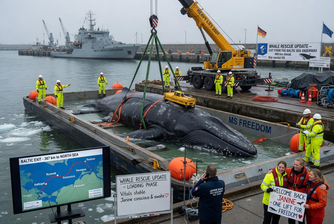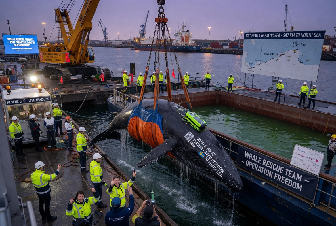 The whale, who has been trapped for weeks in the shallow waters of the Baltic, has shown signs of recovery after a series of rescue operations, including complex lifting maneuvers and careful medical care. The decision to move the whale by ship was made after experts determined it was the safest option for transportation, given the whale’s size and fragile condition.