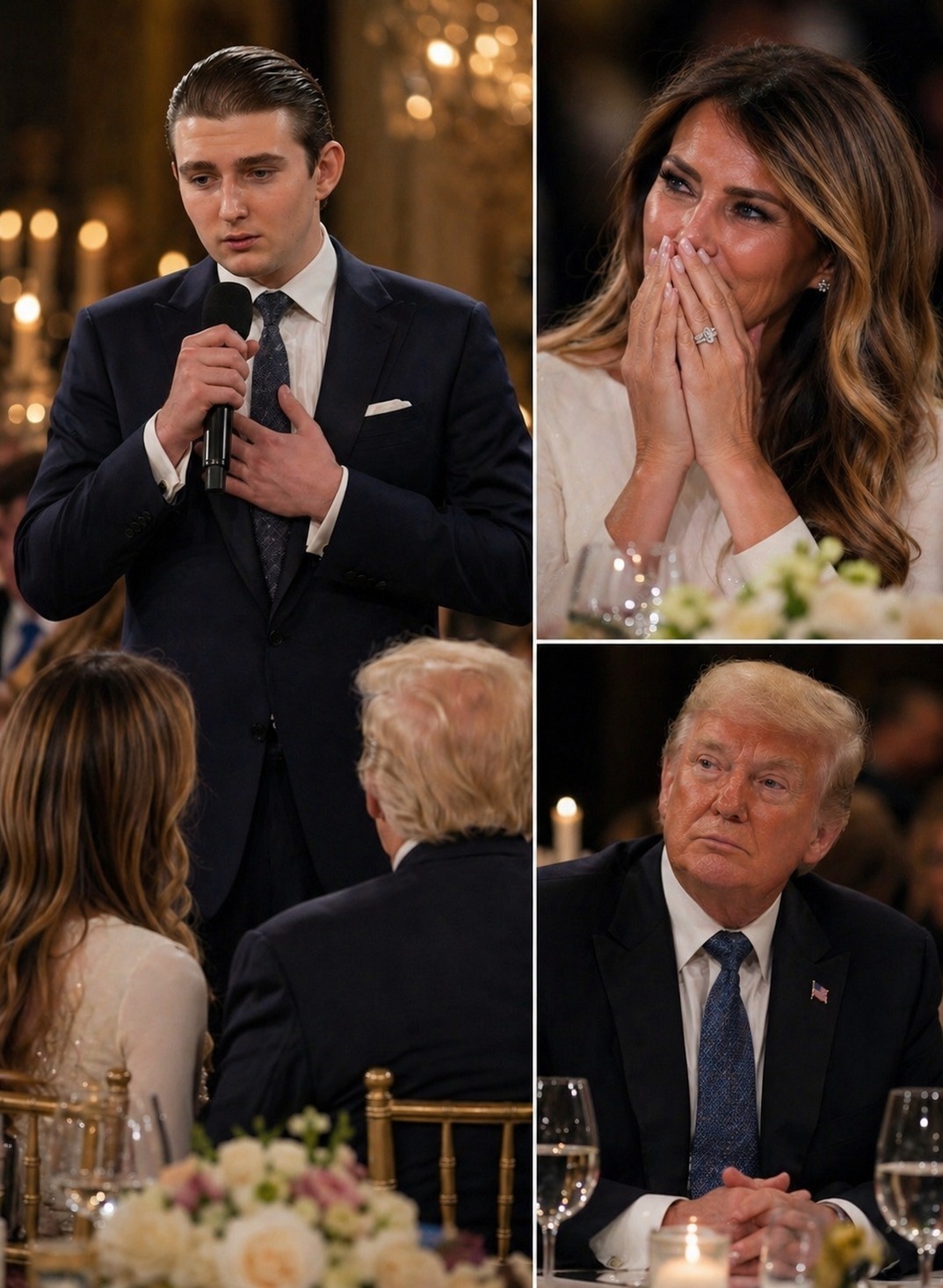 Barron began with a slight hesitation, a rare vulnerability from a young man raised in the eye of a political hurricane. He made a small, unguarded gesture toward his parents—a movement so personal and devoid of artifice that it seemed to strip away the years of public persona surrounding the family. As his voice carried through the room, the impact was immediate. Melania, known for her stoic and composed demeanor, found her defenses dissolving. An overwhelming wave of emotion rose within her, visible in the way her gaze locked onto her son. She would later confess to close associates that she had not felt such a profound sense of movement in years. This was not a scripted tribute; it was a raw collision of memory, shared struggle, and the fierce bond of family.