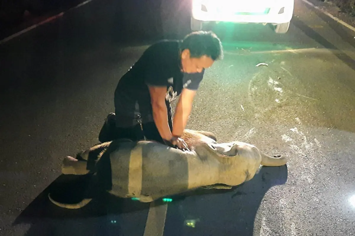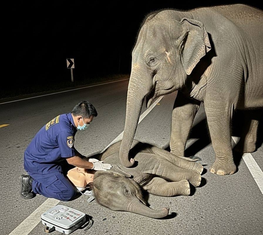 Srivate, an experienced member of Thailand’s rescue services with more than 26 years in the field, happened to be off duty when he encountered the injured animal. Acting on instinct, he rushed to the elephant’s side and began performing CPR — using a technique similar to that used on humans, though adapted to the animal’s size.