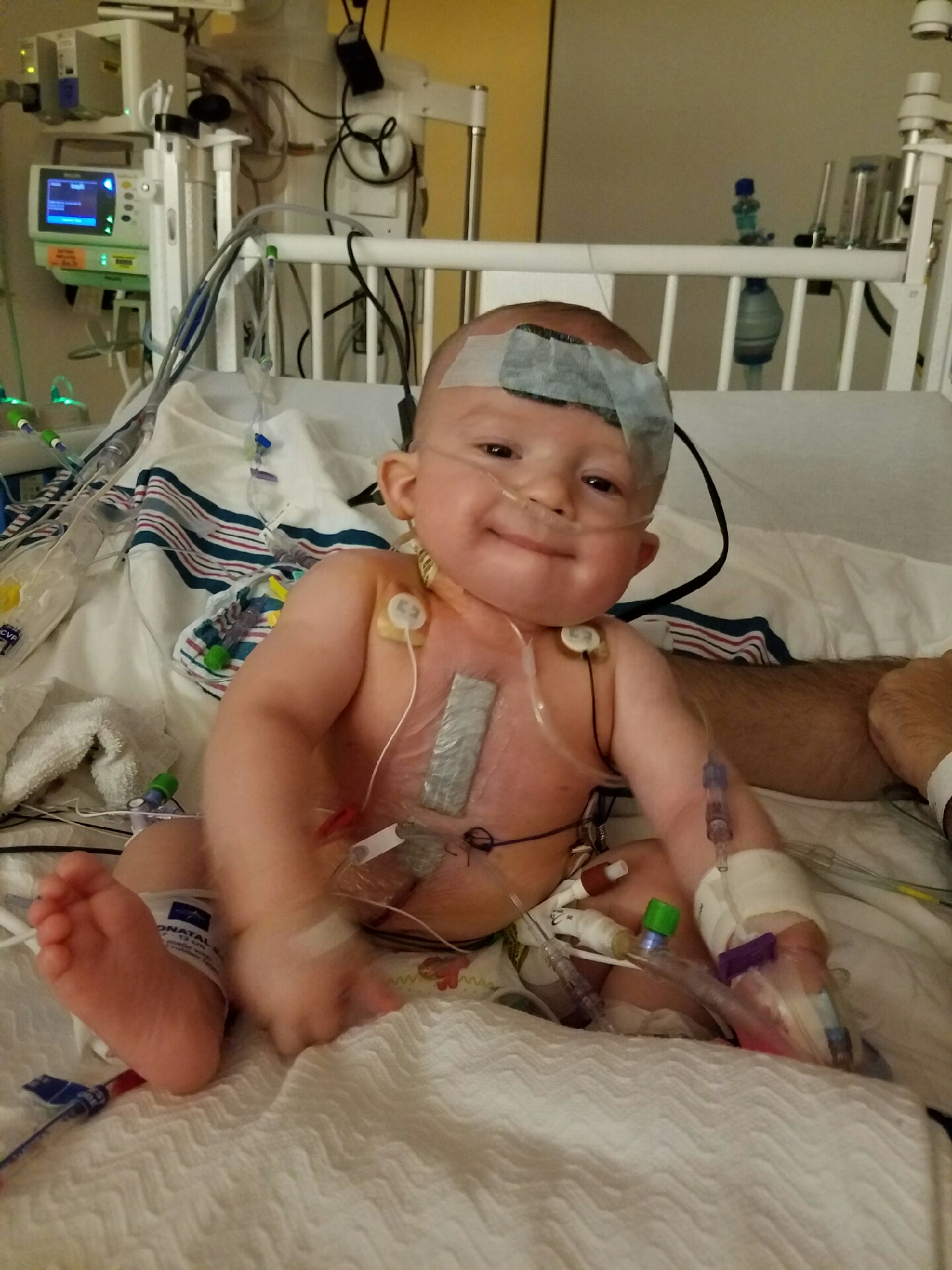 When he was just five days old, Jackson underwent a 13-hour operation that would save his life. Hanley and his team did a complex overhaul of Jackson’s heart: they inserted a pulmonary valve, reduced the size of Jackson’s right pulmonary artery, and enlarged his small, disconnected, left pulmonary artery. Hanley also used an innovative and intricate LeCompte maneuver, which altered the pathway of Jackson’s right and left pulmonary arteries from the back of the heart and aorta to the front. The double repair technique connects the left ventricle to the aorta and the right ventricle to the pulmonary artery using a technique that does not require an extracardiac conduit. This gave his severely compromised bronchial tubes room to grow and remodel after surgery was over.